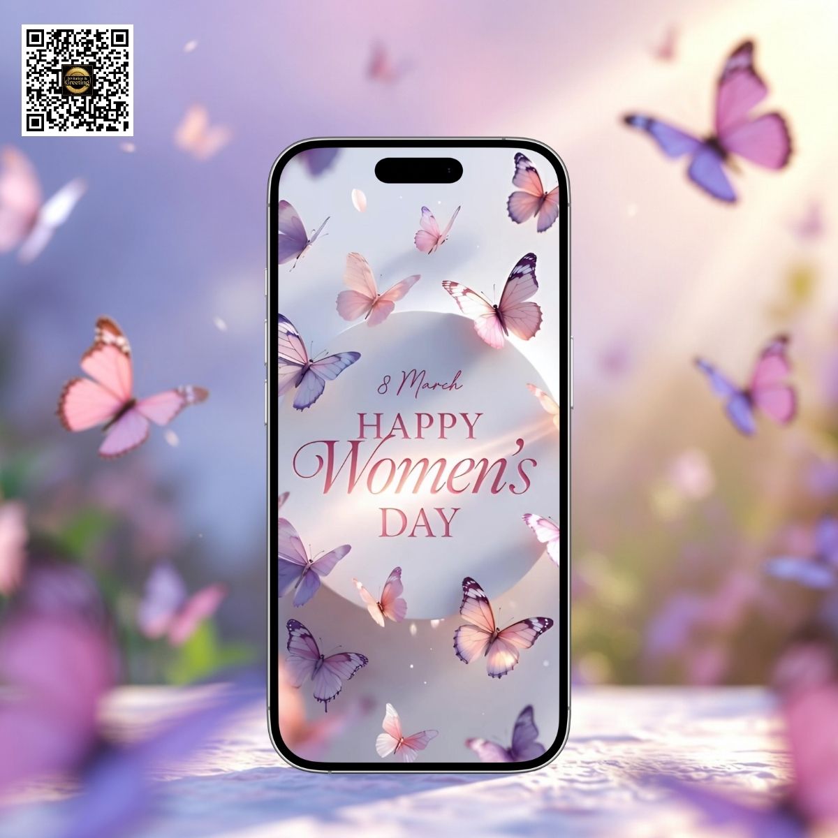 This elegant design features soft pastel butterflies, floating petals, and warm cinematic lighting that creates a magical and uplifting greeting experience.